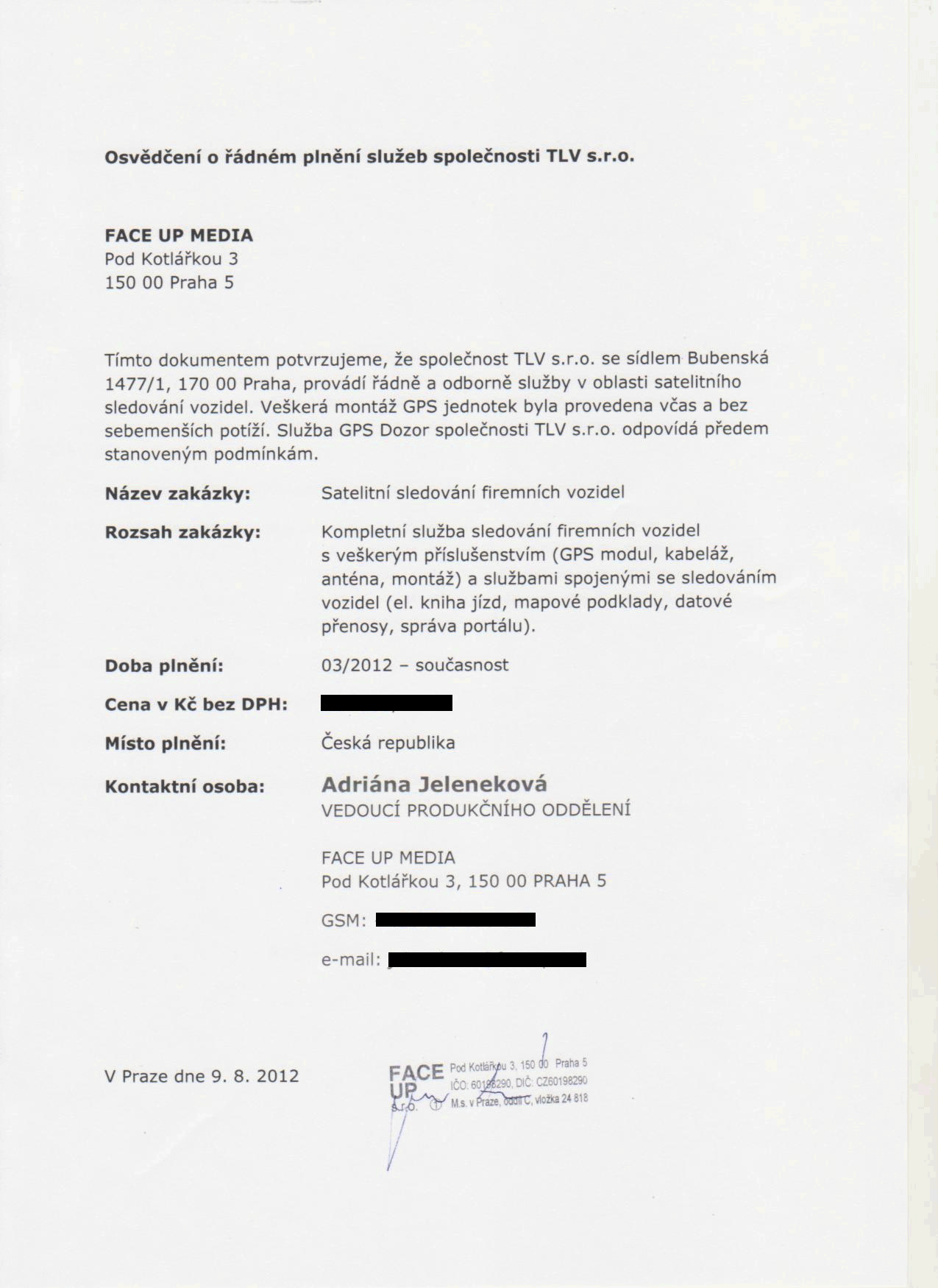 GPS dozor u firmy TLV s.r.o jsme zavedli především v souvislosti s úsporami provozních nákladů vozového parku . Z obecného hlediska vidím velkou výhodu ve GPS dozoru, že nám pomáhá monitorovat a optimalizovat pracovní aktivity našich zaměstnanců. Vím kde se přesně nacházejí, jaké byly přejezdy a jakou dobu jim trvá předmět jejich činnosti v určeném místě. Přesně víme, kdy začali pracovat a kdy skončili proto věta „nestíhám mám toho hodně“ už jako argument zmizela.