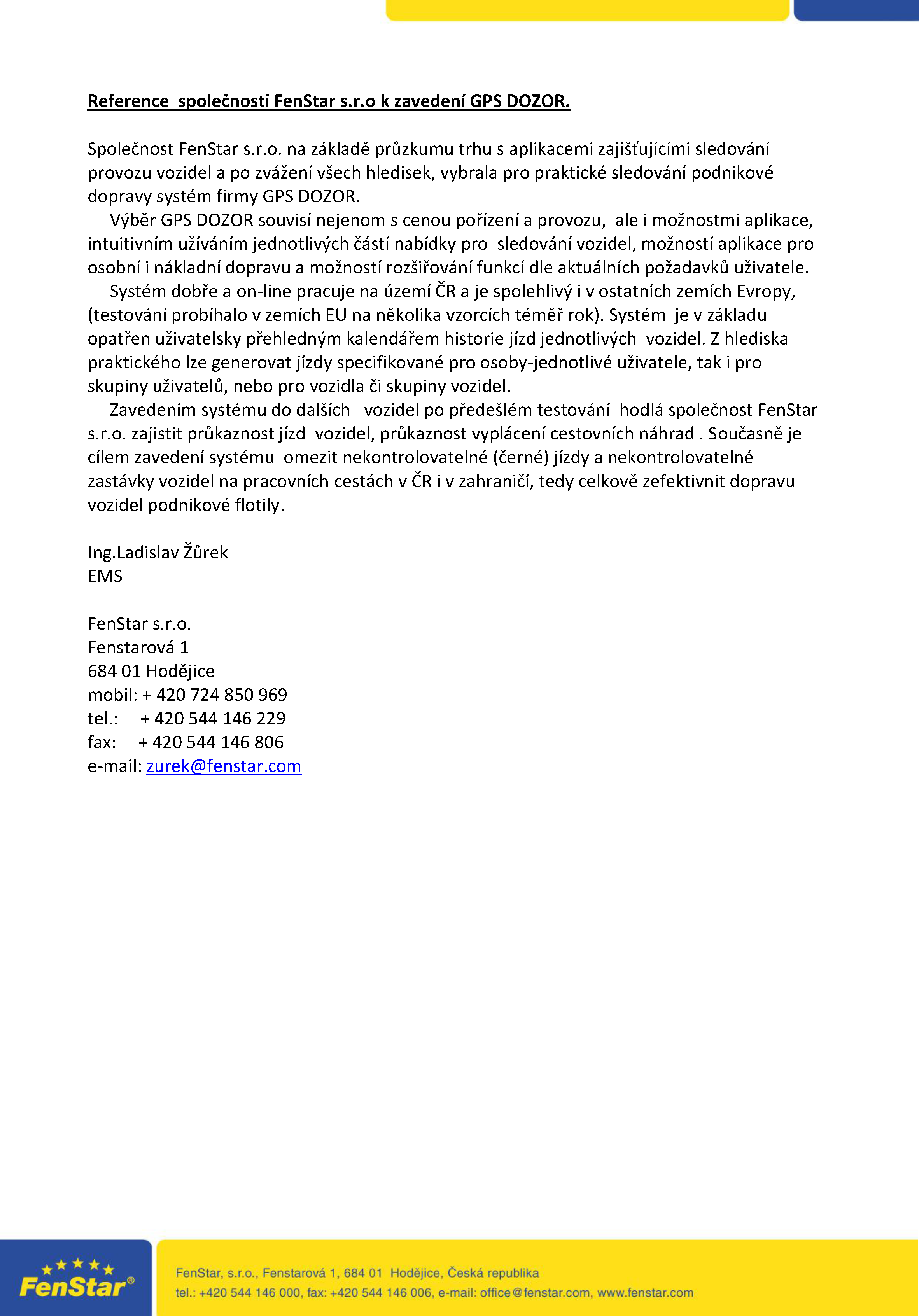 Společnost FenStar s.r.o. na základě průzkumu trhu s aplikacemi zajišťujícími sledování provozu vozidel a po zvážení všech hledisek, vybrala pro praktické sledování podnikové dopravy systém firmy GPS DOZOR.